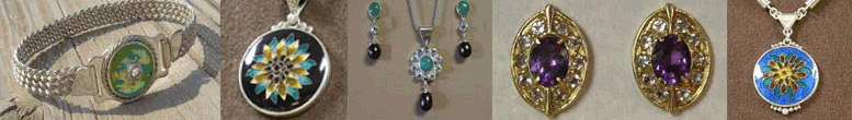 High fire enamel is one of the artist's favorite techniques. In many fabricated jewelry pieces a Cloisonn or Basse taille plaque is used as the focus of the design. Making the enamel plaque is a painstaking process of specific and controlled steps that results in the fusing of glass to metal. First, the colors of glass are ground by hand to the consistency of fine sugar. When using transparent enamel, hand grinding just prior to use is essential in maintaining their gem like clarity. This glass is applied in thin layers to fine silver (.999) and fired at 1500 degrees F. between each layer. After each firing the piece is hand ground to keep its' proper form. An individual piece of jewelry may have as many as 15 layers, each requiring individual firing and grinding.